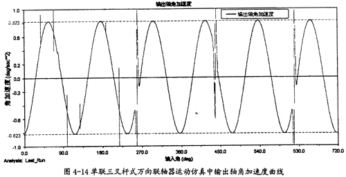 由圖4-9可以知道,當輸入軸轉(zhuǎn)速恒定為90o/s時,輸出軸并不作恒速轉(zhuǎn)動,而是以90o/s為中心,作非常有規(guī)律的周期性運動,在每一個回轉(zhuǎn)周期中,它的變化頻率為3次。這里的結(jié)果同第三章中的曲線圖3-8也是完全吻合的,因此在一定的程度上也證明了三叉桿萬向聯(lián)軸器轉(zhuǎn)速分析理論的正確性。