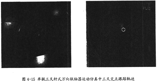 由圖4-15可以看出,在單聯(lián)三叉桿式萬向聯(lián)軸器的運動仿真中,三叉交點運動軌跡是一個圓,相對于半徑值R(此值的意義見第三章)它的半徑是相當小的,這也解釋了為何運動中兩軸夾角在不斷作微小的變化,同時也證明了軸頭中心軌跡理論的正確性。