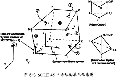此單元為3-D固體結(jié)構(gòu)單元,由八個(gè)節(jié)點(diǎn)組成,在單元的每一節(jié)點(diǎn)上有三個(gè)自由度,即分別沿著三個(gè)坐標(biāo)軸的方向。此單元可以進(jìn)行塑性、蠕變、應(yīng)力硬化、大變形以及大應(yīng)變分析,是結(jié)構(gòu)分析中的最常用單元。單元結(jié)構(gòu)如圖6-3,此單元有兩種退化形式(見圖6-3右邊)。