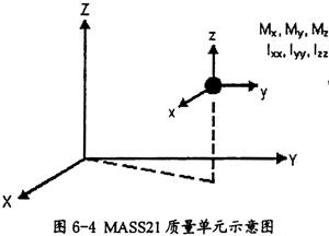 此單元為一個(gè)有六自由度的質(zhì)量單元。此單元的第一個(gè)不同的坐標(biāo)方向上可以施加不同的質(zhì)量大小和轉(zhuǎn)動(dòng)慣量。質(zhì)量單元是由單個(gè)節(jié)點(diǎn)、單元坐標(biāo)方向的集中質(zhì)量系數(shù)、單元坐標(biāo)軸的旋轉(zhuǎn)慣性所決定的。為了在加入質(zhì)量單元后不影響系統(tǒng)的慣性屬性,在此單元的實(shí)常數(shù)設(shè)定中慣性量應(yīng)設(shè)定的非常小(如小于10-4)。單元如圖6-4所示。