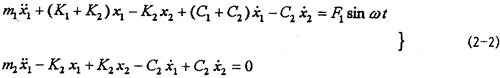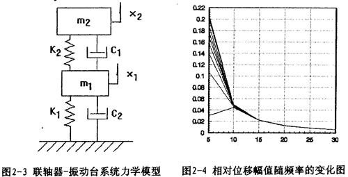 對(duì)應(yīng)的力學(xué)模型如圖2-3(見(jiàn)22頁(yè))所示,式中m1為振動(dòng)臺(tái)動(dòng)圈、聯(lián)軸器外套及固定在振動(dòng)臺(tái)上夾具的質(zhì)量;m2為聯(lián)軸器內(nèi)套、芯軸及配重的質(zhì)量;K1為振動(dòng)臺(tái)支撐動(dòng)圈部分的剛度系數(shù),K2為聯(lián)軸器彈性元件的剛度系數(shù);C1為振動(dòng)臺(tái)動(dòng)圈阻尼系數(shù);C2為聯(lián)軸器