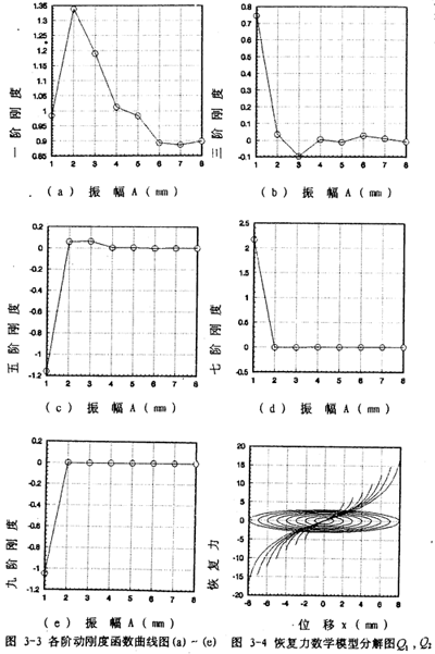 將(3-27)式中剛度函數(shù)作成曲線如圖3-3(a)-(e)所示,由一階動(dòng)剛度函數(shù)圖3-3(a)可知,振幅在lmm~2mm范圍內(nèi)時(shí),動(dòng)剛度隨振幅增大而增大,呈硬特性;當(dāng)振幅在2mm~7mm范圍內(nèi)時(shí),動(dòng)剛度隨振幅增大而減小,呈軟特性;當(dāng)振幅在7mm~8mm范圍時(shí),動(dòng)剛度隨振幅增大略有回升。由此圖可知,在聯(lián)軸器初始小振幅和極限振幅附近范圍內(nèi),動(dòng)剛度呈硬特性,而在中間振幅范圍內(nèi)呈軟特性。K5(A)和K9(A)也具有類似的特性。而K3(A)和K7(A)在小振幅時(shí)呈軟特性,這樣的動(dòng)剛度特性滿足船舶緩沖減振降噪的要求,即在一般低能量風(fēng)浪流作用下,該聯(lián)軸器鋼絲繩元件的變形小,動(dòng)剛度大,呈硬特性,這能保證船舶推進(jìn)軸系的基頻高于風(fēng)浪流的顯著能量頻率;在大能量風(fēng)浪流和沖擊作用下時(shí),聯(lián)軸器由于載荷增大而變形增大,這種情況下動(dòng)剛度軟化,使船舶推進(jìn)軸系頻率變小,向遠(yuǎn)離大能量風(fēng)浪流和沖擊顯著能量頻率一側(cè)偏移,在遲滯阻尼下耗散能量,使軸系沖擊振動(dòng)響應(yīng)降低。由(3-27)式和(3-12)式可作出相應(yīng)的彈性恢復(fù)力單值曲線如圖3-4所示。將圖3-4中代表彈性恢復(fù)力的單值曲線與圖3-2中的單值曲線比較可知,(3-12)式能較好地描述聯(lián)軸器彈性恢復(fù)力隨振幅變化的規(guī)律。