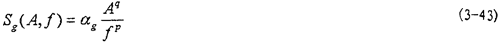 對于(3-22)模型,我們用阻尼耗能的能量關系來辨識阻尼力與振幅和頻率的關系。在前面,遲滯回線面積(即阻尼耗能)與振幅的函數(shù)關系已建立起來,見(3-38)式,而且式中參數(shù)也已辨識出。同樣,用數(shù)值積分,可以算出振幅一定,頻率變化時遲滯回線的面積,由此得出遲滯回線面積與頻率的對應關系,將這些對應關系畫成曲線如圖3-6中大圓點曲線所示。由遲滯回線面積隨頻率變化的規(guī)律分析,可建立其函數(shù)關系為: