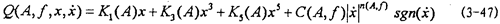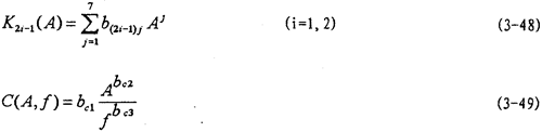 的函數(shù),或者說恢復力Q是剛度函數(shù)K1(A),K3(A),K5(A)和阻尼函數(shù)C(A,f)以及阻尼成分函數(shù)n(A,f)的函數(shù),其中阻尼成分函數(shù)n(A,f)描述阻尼的組成情況,n(A,f)=0時,阻尼為干摩擦阻尼,n(A,f)=1時,為粘性阻尼,0<n(A,f)<1時,阻尼由粘性阻尼和干摩擦阻尼組成,n(A,f)>1時,阻尼成為“高階”阻尼。對于(3-47)式,當振幅與頻率一定時,式中的Kl(A),K3(A),K5(A)和n(A,f)均為定數(shù),當振幅A和頻率變化時,它們均是函數(shù),因此參數(shù)辨識實質(zhì)上是參數(shù)函數(shù)的辨識。首先我們用非線性參數(shù)辨識方法Marquardt法,根據(jù)試驗所得的數(shù)據(jù),按照(3-47)式對每一遲滯回線進行參數(shù)辨識,可以得到對應的K1(A),K3(A),K5(A),C(A,f)和n(A,f)值,對每種工況下的數(shù)據(jù)隨振幅和頻率變化趨勢進行分析后,可以建立剛度函數(shù)、阻尼函數(shù)和阻尼成份函數(shù)的數(shù)學表達式為: