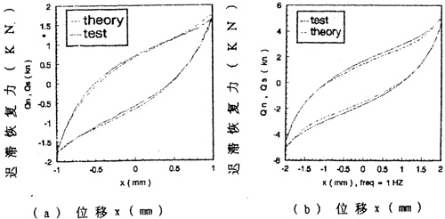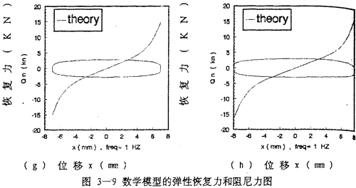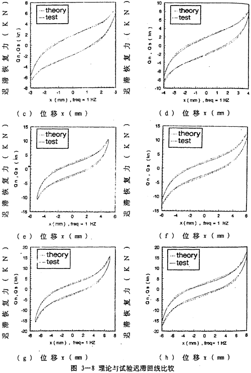 由數(shù)學模型(3-47) 計算可以得到不同激勵頻率和振幅下聯(lián)軸器恢復力遲滯回線數(shù)據(jù),為了證實(3-47)的正確性,下面畫出頻率為1赫茲、振幅為1~8毫米各工況下數(shù)學模型計算的理論數(shù)據(jù)和試驗數(shù)據(jù)表示的遲滯回線圖,如圖(3-8)(a)~(h)(見51~52頁)所示,圖中虛線為理論回線,實線為試驗遲滯回線。從圖中可知,理論遲滯回線十分接近試驗遲滯回線,由此可以說明建立的聯(lián)軸器數(shù)學模型(3-47)式可較好地描述恢復力隨振幅A頻率f、瞬時位移x和速度