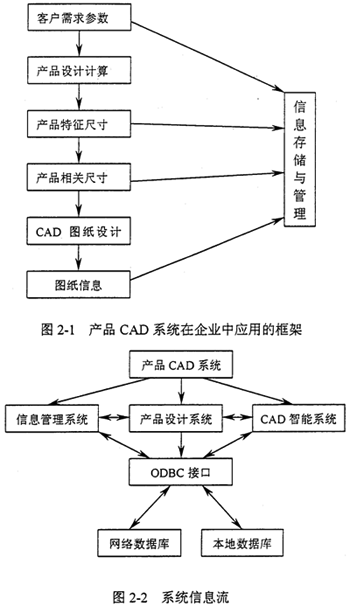 從企業(yè)的角度來說,利用計算機技術(shù),將企業(yè)的產(chǎn)品設(shè)計流程與企業(yè)管理有效地結(jié)合起來(圖2-l),實現(xiàn)企業(yè)管理與產(chǎn)品設(shè)計一體化。從系統(tǒng)實現(xiàn)的角度來說,是將CAD系統(tǒng)、信息管理系統(tǒng)和工程數(shù)據(jù)庫在網(wǎng)絡(luò)上的結(jié)合,見圖2-2,產(chǎn)品CAD系統(tǒng)包括產(chǎn)品信息管理系統(tǒng)和CAD的二次開發(fā)系統(tǒng),特點突出: