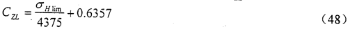 其中,在850N/mm2≤σH1im≤1200N/mm2范圍內(nèi),CZL可由式(47)算得。當(dāng)σH1im<850N/mm2時(shí)取CZL=0.83;當(dāng)σHlim>1200N/mm2時(shí)取CZL=0.91
