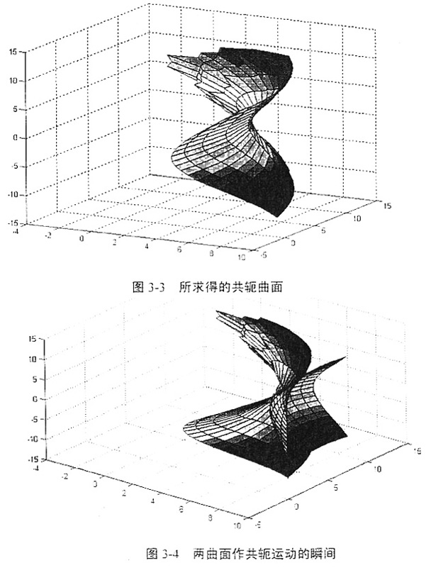求出共軛曲面各節(jié)點(diǎn)坐標(biāo)值后,調(diào)用MATLAB繪圖命令就可以顯示共軛曲面的圖形,并通過(guò)編制的程序,還能夠以動(dòng)畫(huà)的形式演示兩曲面作共軛運(yùn)動(dòng)的過(guò)程。求得的共軛曲面及兩曲面作共軛運(yùn)動(dòng)的瞬間分別如圖3-3、圖3-4所示: