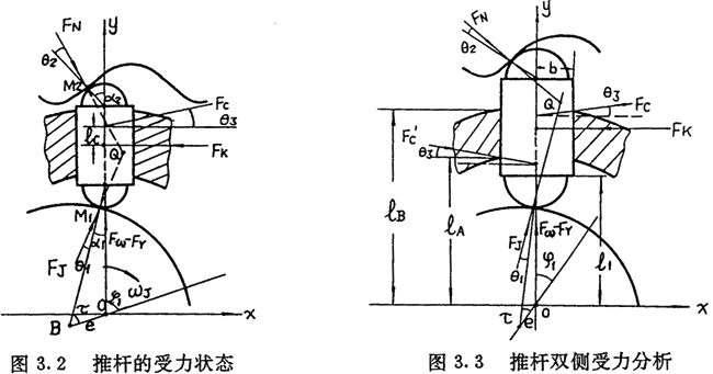 當(dāng)FJ、FN二力的交點Q落在傳動圈所在環(huán)內(nèi)(圖3.2所示),推桿呈現(xiàn)單側(cè)受力狀態(tài)(右側(cè)受力),對推桿質(zhì)心取矩,可得如下平衡方程式: