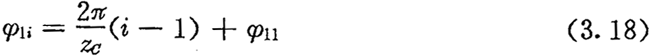 由于相鄰兩推桿所夾的中心角為2π/ZC,在某一時刻,只要其中一個工作推桿所對應(yīng)的激波器位置角(激波器相對該推桿從初始工作位置轉(zhuǎn)過的角度φ1)確定后,其它各工作推桿所對應(yīng)的激波器位置角也隨之確定下來。設(shè)各工作推桿所對應(yīng)的最小激波器位置角為φ11,如圖3.6所示,則從對應(yīng)激波器位置角為φ11的這個工作推桿開始,順序第i個工作椎桿所應(yīng)的激波器位置角φ1i為: