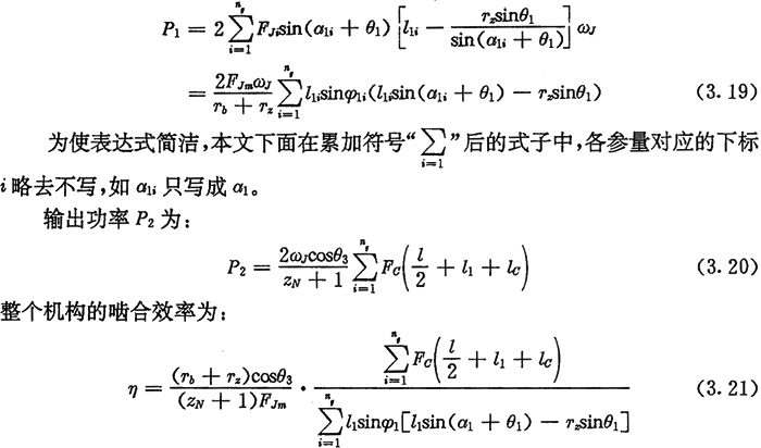 計算時,先根據(jù)輸入功率P1及轉(zhuǎn)速ωJ由(3.19)式計算出FJm,然后對每一工作推桿由式(3.17)計算出FJi,由式(3.10)式及式(3.11)計算出Fci及l(fā)ci,最后代入式(3.21)計算出效率η。