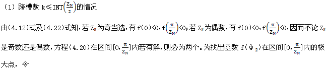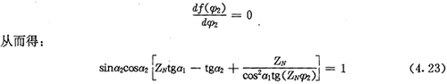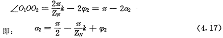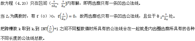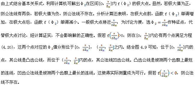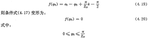 上式就是齒廓AB上與跨槽數(shù)為k的齒廓具有公法線的點(diǎn)的條件。當(dāng)k確定后,若存在公法線,則由(4.17)式并結(jié)合基本關(guān)系式(2.38)等可解出φ2的值來(lái)。