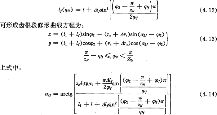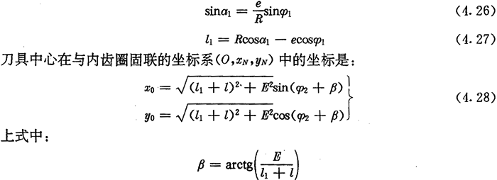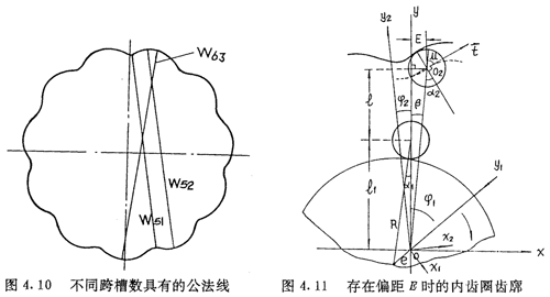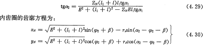 若令(4.30)式和(4.31)式中的E=0,得到的就是無(wú)偏距時(shí)的內(nèi)齒圈齒廓理論方程式(2.21)及公法線長(zhǎng)度(4.18)式。