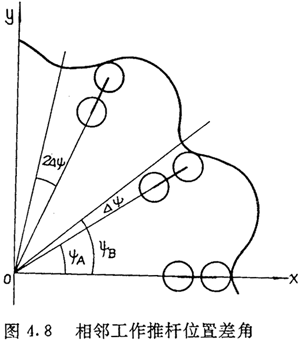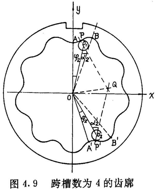 如圖4.9 所示,AB是其中一個(gè)齒槽的一側(cè)齒廓,A′B′是跨槽數(shù)為K(圖中k=4)的一個(gè)齒梢的另一側(cè)齒廓,它們是兩個(gè)性質(zhì)不同的齒廓。若把AB看成是工作齒廓,則A′B′是非工作齒廓。選擇圖4.9所示的坐標(biāo)系,讓坐標(biāo)原點(diǎn)O與內(nèi)齒圈幾何中心重合,y軸與OA重合。設(shè)P(x,y)為AB齒廓上的一點(diǎn),在P點(diǎn)與內(nèi)齒圈齒廓相接觸的外滾子的位置角為φ2,在A′B′上取P點(diǎn)的對(duì)應(yīng)點(diǎn)P′,使∠A′OO2=φ2,P′點(diǎn)與P點(diǎn)是關(guān)于∠AOA′的平分線完全對(duì)稱的,即0P′=OP,a2=a2′,OO1=OO2,圖4.9中PO1與P′O2相交在Q點(diǎn),它們并不共線,因此P′點(diǎn)與P點(diǎn)不具有共同的法線。假設(shè)隨著P點(diǎn)位置的改變(當(dāng)然P′點(diǎn)也隨著P的改變而改變),使PO1與P′O2在同一條直線上,此時(shí)P′與P就有共同的法線,此時(shí):