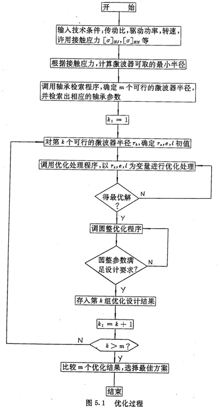 由于激波器一般使用通用軸承,所以激波器半徑Tb應(yīng)結(jié)合軸承標(biāo)準(zhǔn)來選擇。在程序中,先給各傳動參數(shù)指定其取值范圍的中間數(shù)值,然后根據(jù)接觸應(yīng)力計算,確定滿足強(qiáng)度條件的最小激波器半徑,由軸承檢索程序,確定若干個可行的激波器半徑。在確定可行的激波器半徑時,為了使減速器外徑尺寸不致過大,僅把與應(yīng)力計算結(jié)果相近的軸承半徑及其相鄰型號半徑作為可行的激波器半徑。對每一個可行的激器半徑Tb,調(diào)用優(yōu)化子程序以Tz,e,l為優(yōu)化變量進(jìn)行優(yōu)化處理。其算法流程如圖5.1所示。