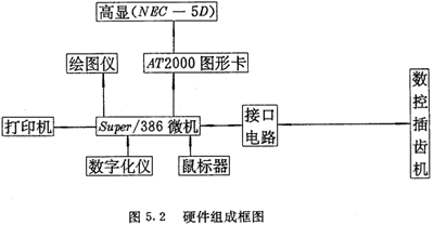 本系統(tǒng)是在一臺微型計算機(jī)super/386基礎(chǔ)上,增加一塊選進(jìn)的圖形卡,一臺高分辨率顯示器,數(shù)控接口電路及相應(yīng)設(shè)備,組成了一個微機(jī)工作站,如圖5.2所示。