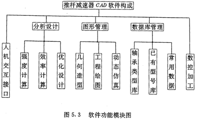 軟件主要由分析設(shè)計、圖形管理、數(shù)據(jù)庫管理及摟控加工四大部分組成,并提供了一個友好的人機(jī)交互接口界面用于實現(xiàn)漢字人機(jī)對話。本交互接口由三級推拉彈出式菜單組成。軟件模塊結(jié)構(gòu)如圖5.3所示。各大模塊的主要功能及特點(diǎn)如下: