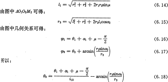 假設(shè)圖6.4中O1、M1、M2三點始終都能保持在同一直線上,則對于太陽輪轉(zhuǎn)角φ1,圖6.4中的α2可根據(jù)圖6.3中的行星輪轉(zhuǎn)角θ2求得,由圖中幾何關(guān)系及(6.4)式應(yīng)有