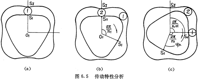 固定內(nèi)齒圈,當(dāng)太陽輪起點從初始位置開始轉(zhuǎn)動到與行星輪重新在初始位置接觸時,太陽輪轉(zhuǎn)過的圈數(shù)與行星輪公轉(zhuǎn)過的圈數(shù)之比ip12稱作太陽輪與行星輪的均傳動比。圖6.5(a)為初始位置,圖6.5(c)為太陽輪按順時針方向相對行星輪1轉(zhuǎn)過一個周期后的情形。此時內(nèi)齒圈相對該行星輪也應(yīng)轉(zhuǎn)過一個周期,即行星輪1從初始位置公轉(zhuǎn)過的角度為: