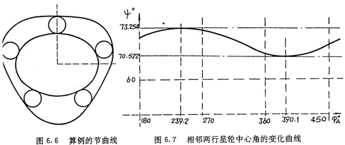 節(jié)曲線形狀如圖6.6所示。圖6.2為該輪系加上輪齒后的情形。按(6.34)式可算得相鄰兩行星輪之間的夾角隨φA的變化規(guī)律,其關(guān)系曲線如圖6.7所示。由曲線圖可看出,當(dāng)φA=239.2°時,夾角ψ有最小值ψmin=70522°,夾角ψ的變化范圍是2.732°。