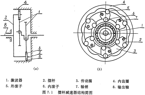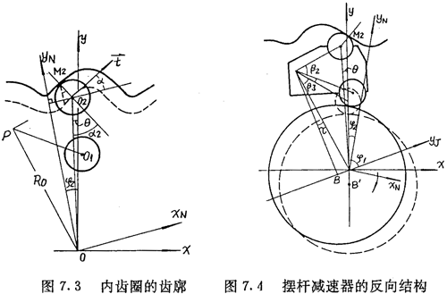 文獻(xiàn)只提出了擺桿活齒傳動(dòng)的一般結(jié)構(gòu)方案,要把這種方案變?yōu)閷?shí)際產(chǎn)品,還有許多理論問(wèn)題需要解決。例如對(duì)機(jī)構(gòu)傳動(dòng)特性的分析,效率計(jì)算,強(qiáng)度校核,以及內(nèi)齒圈齒廓的測(cè)量等等。本章從擺桿減速器的傳動(dòng)原理著手,對(duì)這些問(wèn)題進(jìn)行了詳細(xì)的分析討論,為擺桿減速器的制造奠定了理論基礎(chǔ)。