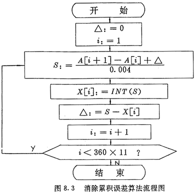 用式(4.4)及式(4.5)計(jì)算nx和nc時,得到的不可能恰好是整數(shù),為了消除累積誤差,每段中應(yīng)把上一段的誤差考慮進(jìn)去。例如對nx的計(jì)算,假定表8.1中ρd的360×11個數(shù)已存在數(shù)組A中,計(jì)算后的360×11-l個脈沖數(shù)nx存在數(shù)組x中,則計(jì)算過程如圖8.3所示。