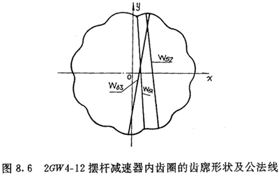 將2GW4-12擺桿減速器的設(shè)計(jì)參數(shù)代入公法線條件式(7.79)中,并給外滾子半徑Tz以增量0.18mm代入,可得到三條不同長度的公法線,如圖8.6所示。