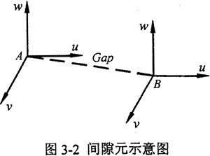在I-DEAS中,間隙元是為防止兩接觸面產(chǎn)生相互嚙入干涉而定義的,如圖3-2所示,A、B分別為具有初始間隙的分離接觸面上的兩節(jié)點(diǎn),把這兩節(jié)點(diǎn)用間隙元Gap連結(jié)起來。在I-DEAS中,間隙元主要有三個(gè)屬性,即初始間隙δ0、方位碼u、同軸標(biāo)志Flag,并且,這三個(gè)值是相互關(guān)聯(lián)的。初始間隙并非模型圖中兩節(jié)點(diǎn)之間的距離,而是由用戶給定的一個(gè)精確值,以避免建模誤差。方位碼指定間隙元的方向,具有從-6到+6之間除O之外的的12個(gè)值,分別代表6個(gè)自由度的正負(fù)方向,即沿x、y、z軸的移動(dòng)和轉(zhuǎn)動(dòng)方向。同軸標(biāo)志取0或1,當(dāng)Flag=0時(shí),方位碼有效,間隙元沿某一指定坐標(biāo)方向;Flag=1時(shí),方位碼無效,間隙元沿兩節(jié)點(diǎn)連線方向。在圖3-2中,設(shè)指定方位碼為沿u向,F(xiàn)lag=0,則當(dāng)uA-uB≤δ0時(shí),認(rèn)為間隙元沒有閉合,接觸面間不會(huì)產(chǎn)生應(yīng)力應(yīng)變。而一旦uA-uB>δ0,則認(rèn)為間隙元已閉合,間隙元在指定方向?qū)⒕哂泻艽蟮膭偠龋ㄈ笔r(shí)系統(tǒng)一般取接觸面材料的三階),此時(shí)兩節(jié)點(diǎn)無法沿指定方向相互嵌入,而只能沿指定方向切向運(yùn)動(dòng)。如指定接觸面摩擦系數(shù),閉合后的間隙元還將具有一定的橫向剛度,即沿切向摩擦阻尼產(chǎn)生的等效剛度。
