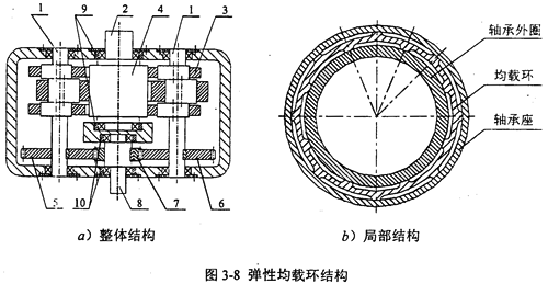 對(duì)于三環(huán)減速機(jī)來說,因三片內(nèi)齒環(huán)板受力大,質(zhì)量大,環(huán)板中心移動(dòng)量小,可以利用本文提出金屬?gòu)椥原h(huán)作為均載機(jī)構(gòu),彈性均載環(huán)加裝在輸出軸和一級(jí)輸入軸上的軸承外圈和軸承座孔之間,彈性均載環(huán)結(jié)構(gòu)如圖3-8所示。a)為整體結(jié)構(gòu),b)為局部結(jié)構(gòu)。輸出軸均載環(huán)9加裝在三環(huán)減速機(jī)的輸出軸2的軸承外圈和軸承座孔之間,輸入軸均載環(huán)10加裝在三環(huán)減速機(jī)的一級(jí)輸入軸8的軸承外圈和軸承座孔之間,彈性環(huán)的變形使輸出軸和一級(jí)輸入軸上的外齒輪浮動(dòng),補(bǔ)償制造安裝誤差和傳動(dòng)變形,從而可以實(shí)現(xiàn)三環(huán)減速機(jī)的均載和減振。