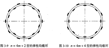 根據(jù)彈性均載環(huán)的外凸臺(tái)數(shù)或內(nèi)凸臺(tái)數(shù)可將這種低剛性彈性支承分為兩類,一類凸臺(tái)數(shù)為n=4m+4,另一類凸臺(tái)數(shù)為n=4m+2,m可為任意自然數(shù)。對(duì)于圖3-9,m=2;對(duì)于圖3-10,m=l。