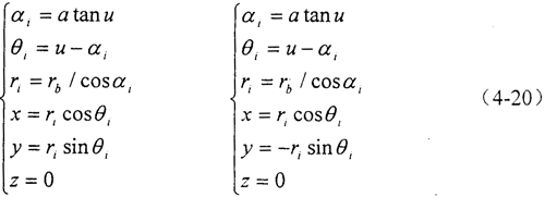 在I-DEAS軟件建模模塊中,已經(jīng)給出一個變量u,它的缺省取值范圍為u∈(0,1),根據(jù)壓力角的實(shí)際取值范圍,可以將其設(shè)為u=tanαi,則輪齒漸開線的參數(shù)方程可以寫成: