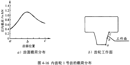 經(jīng)過間隙單元法迭代計算,得到嚙合過程中,由于輪齒的變形而形成了多齒接觸。圖4-14所示為由于輪齒的變形,形成了5個齒的接觸,以及載荷在輪齒之間的分配比例。當(dāng)有5個齒參與嚙合時,最大主應(yīng)力為73MPa;假定內(nèi)、外齒輪的1號齒在齒面上b點(diǎn)相互接觸,圖4-15所示為輪齒接觸時,外齒輪上載荷最大的輪齒1號面的齒面載荷分布情況:圖4-16所示為輪齒接觸時,內(nèi)齒輪上載荷最大的輪齒1號面的齒面載荷分布情況。