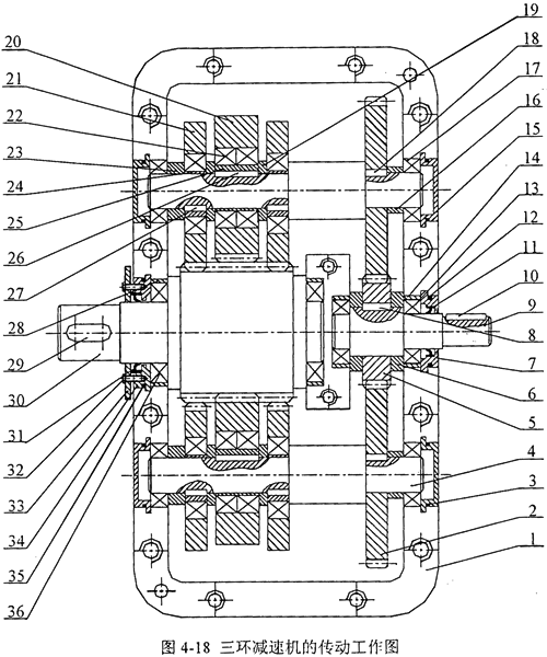 根據(jù)三環(huán)減速機(jī)的基本參數(shù)和結(jié)構(gòu)參數(shù),設(shè)計出三環(huán)減速機(jī)的傳動工作圖如圖4-18所示。