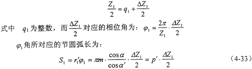 下面來分析它的裝配條件,由于本文提出的新型三環(huán)減速機(jī)環(huán)板相互之間的相位差為180°,所以在分析時,可以只分析兩塊環(huán)板的裝配情況。圖4-19所示為裝配條件分析圖,在兩塊環(huán)板的偏心所構(gòu)成的π角內(nèi),外齒輪1的齒數(shù)為: