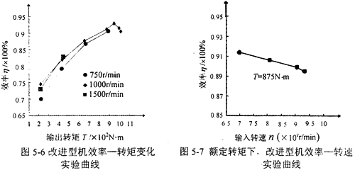 在額定轉(zhuǎn)速和額定轉(zhuǎn)矩范圍內(nèi),改進(jìn)型機(jī)隨著輸出轉(zhuǎn)矩、輸入轉(zhuǎn)速的增加,均載機(jī)構(gòu)補(bǔ)償?shù)恼`差增大,均載效果更加明顯,所以改進(jìn)型機(jī)的傳動(dòng)效率隨輸入轉(zhuǎn)速的增加而增加。綜上所述,三環(huán)減速機(jī)的測(cè)得效率可達(dá)92%以上,因此本實(shí)驗(yàn)從減速機(jī)的傳動(dòng)性能上來(lái)講是成功的。