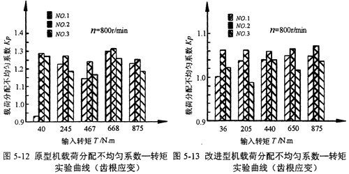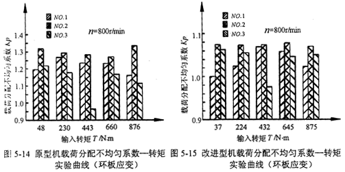對(duì)于加裝均載裝置的改進(jìn)型機(jī),從實(shí)驗(yàn)曲線中可以看出,當(dāng)輸入轉(zhuǎn)速為75Or/min和1O00r/min時(shí),改進(jìn)型機(jī)傳動(dòng)總效率隨輸出轉(zhuǎn)矩、輸入轉(zhuǎn)速的增加而增加;在輸入轉(zhuǎn)速為1000r/min時(shí),當(dāng)輸入轉(zhuǎn)矩超過(guò)95ON·m時(shí),傳動(dòng)效率隨輸出轉(zhuǎn)矩的增加反而下降;當(dāng)輸入轉(zhuǎn)速為15O0r/min時(shí),低輸出轉(zhuǎn)矩時(shí),傳動(dòng)效率較低;隨著輸出轉(zhuǎn)矩的增加,傳動(dòng)效率明顯增高。測(cè)得的改進(jìn)型機(jī)最高效率可達(dá)92.9%。