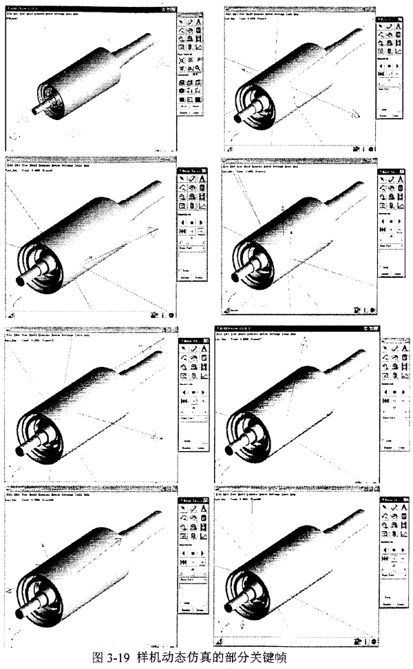 仿真開始后,ADAMS-View自動調(diào)用ADAMS-Solver進(jìn)行求解,并實時地將每一幀顯示在屏幕上,形成動畫。仿真過程的部分關(guān)鍵幀見圖3-19。