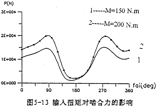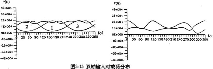 由上式可知,當(dāng)減速器幾何參數(shù)一確定,e及r2均為已知參數(shù)。因此增大M,必須引起左邊的行星軸承載荷F(j)Lx,F(xiàn)(j)1y增大使方程式(5-30)平衡。圖5-13是輸入扭矩分別為150N.m及200N.m時的嚙合圖。由圖可看出,負(fù)載增加,嚙合力幅值增大。采用雙軸輸入時可降低各載荷的幅值,使其均衡化。圖5-14是單軸輸入時的嚙合力及行星軸承載荷。圖5-15是雙軸輸入時的嚙合力及行星軸承載荷。從兩圖比較得知,無論是嚙合力,還是軸承載荷,采用雙軸輸入后其變化均趨于平緩,幅值降低很多,三相嚙合力趨于均衡,而且負(fù)向嚙合力已消除。