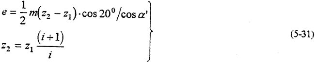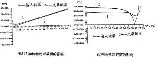 由上式知,當(dāng)齒數(shù)差Z2-Z1越小或傳動比i越大時,偏心距e越;壓力角越大時,偏心距e越大,則選用的行星軸承尺寸大,齒板高速軸承孔徑也就大。圖5-17是傳動比、壓力角、以減速器行星軸承載荷的影響。由圖可見,傳動比的變化對減速器的動力性能影響極大;傳動比越大,則偏心距越小。由式(5-30)分析得,行星軸承載荷必須大。壓力角的變化,對行星軸承載荷影響小得多。
