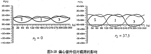 圖5-18是偏心套外徑對嚙合圖的影響。當(dāng)不考慮偏心套外徑(r2=0)時,嚙合力分布為正值?紤]偏心套外徑(r2=37.5mm)計算結(jié)果,出現(xiàn)負(fù)向嚙合力。而且其幅值明顯增大。輸入扭矩也不再是固定值。因此,對三環(huán)減速器進(jìn)行動力計算,必須考慮r2的影響。此外,行星軸承內(nèi)外圈接觸承載位置,也影響三環(huán)減速器的動力性能。