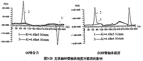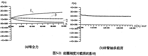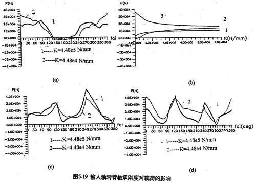 只考慮行星軸承變形及齒板變形時,影響三環(huán)減速器載荷特性的剛度,主要是行星軸承剛度、和內(nèi)齒圈的變形剛度。軸承剛度與軸承材料、間隙、油膜等很多因素有關(guān)。圖5-19是輸入軸行星軸承剛度對嚙合力及行星軸承載荷的影響。當(dāng)輸入行星軸承剛度小一個數(shù)量級時,負(fù)向嚙合力區(qū)域增大(見圖5-19a);隨剛度減小、各相嚙合力越不均恒(圖5-19b),輸入軸行星軸承剛度的影響比輸入軸行星軸承剛度更大,見圖5-20所示。嚙合力及各行星軸承載荷在軸承剛度較小的情況時,都出現(xiàn)正常載荷的10倍以上的沖擊現(xiàn)象,沖擊產(chǎn)生的位置隨剛度變化不同。內(nèi)齒圈剛度對載荷的影響與行星軸承剛度相反(見圖5-21所錄)。當(dāng)剛度越小時,三相齒板的嚙合力越均恒(見圖5-21a),而且行星軸承載荷幅值基本上不變(見圖5-21b)。同此可推知,減小三環(huán)減速器振動的途徑之一就是提高行星軸承剛度,減小內(nèi)齒圈剛度。這可以通過對行星軸承進(jìn)行預(yù)緊,和采用軟齒面或大柔度齒圈的辦法,以使嚙合力和行星軸承載荷均衡化,以達(dá)到減振降噪的目的。