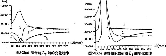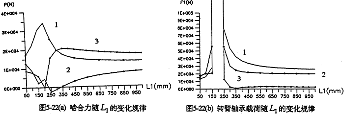 各軸水平布置時,軸間的中心距變化,將引起各載荷大小幅值、規(guī)律均發(fā)生變化。圖5-22是輸入軸相對輸出軸位置變化時,減速器的嚙合力及軸承載荷變化情況。由圖可知,當(dāng)輸入軸與支承軸中心距(L2=200mm)很小時,三齒板的嚙合力分配很不均衡,隨著L1的增加嚙合力趨于均衡(見圖5-22a)。行星軸承載荷變化情況見圖5-22b所示。