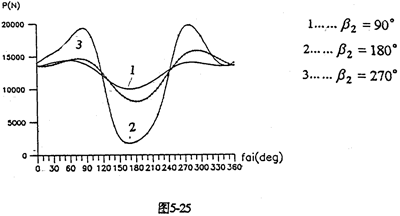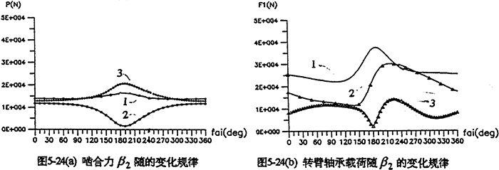 當(dāng)輸入軸與軸出軸的中心距確定后,可通過調(diào)整支承軸的位置,滿足特殊的空間位置要求,或者設(shè)計成載荷分布特性最優(yōu)、幅值最小的減速器。圖5-24是中心距L1=400mm、L2=200mm時,支承軸相對于輸出軸轉(zhuǎn)動的角位移β2變化時嚙合力及行星軸承載荷的分布情況。由圖看出,各種載荷均在180°附近(SHQ偏置式減速器)取得極大值。在0°~90°和270°~360°范圍(Ⅰ、Ⅳ限內(nèi)),三相齒板嚙合力分配很均衡,嚙合沖擊很小。因此。設(shè)計三環(huán)減速器時,為減小載荷的幅值和各相之間載荷的差值、支承軸應(yīng)盡可能遠(yuǎn)離180°,即不采用三軸心共線的水平位置的結(jié)構(gòu)。圖5-25為幾個特殊位置的嚙合力隨轉(zhuǎn)角變化的分布規(guī)律。