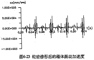 由于機(jī)構(gòu)過(guò)死點(diǎn)時(shí),因變形要引起死點(diǎn)沖擊,可以通過(guò)死點(diǎn)位置及其附近的輪齒(齒板)進(jìn)行修形,使三相載荷均衡化。圖6-23是將死點(diǎn)位置輪齒修形后,軸承座的振動(dòng)加速度圖。與圖6-21(a)比較,總體幅值明顯下降。