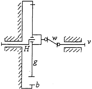 由公式(2-1)可知,在徑向尺寸受到一定的限制時,要獲得較大的傳動比,必須減少中心輪Za的齒數(shù)。但Za受到最小根切齒數(shù)的限制,不能太小。因此,為了獨得較大的傳動比,人們把行星輪加大,甚至完全去掉中心輪,于是演變出行星齒輪傳動的另一種形式:K-H-V行星齒輪傳動,其結構圖見2-2所示。它的基本構件中心輪b、轉臂H和構件V,當中心輪固定,轉臂為主動,構件V從動時,傳動比為:
