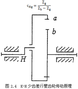 平行軸擺線針輪的基本原理是K-H少齒差行星齒輪傳動原理,見圖2.4,它應用2.1中結構形式,將平行雙曲柄四桿機構的曲柄,α是連桿內(nèi)齒輪,b是定軸輸出外齒輪。其傳動比為: