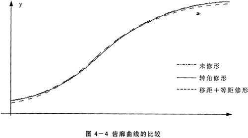 采用這種方法加工擺線輪時(shí),磨齒機(jī)的調(diào)整和加工標(biāo)準(zhǔn)齒廓時(shí)相同,只是在磨出標(biāo)準(zhǔn)齒廓以后,將分齒機(jī)構(gòu)和偏心機(jī)構(gòu)的聯(lián)系脫開(kāi),然后撥動(dòng)分齒掛輪上的齒輪,使工作臺(tái)轉(zhuǎn)過(guò)一微小的角度δ,從而改變了擺線輪在上一次磨削時(shí)的初始位置。這樣重新磨削后,就得到一條與標(biāo)準(zhǔn)齒廓基本上一樣的齒廓,僅整個(gè)輪齒變瘦一些,而齒間變大一些;其特點(diǎn)是同時(shí)嚙合齒數(shù)較多,但擺線輪的齒頂和齒根圓直徑?jīng)]有變化,該處與針齒相嚙合時(shí)沒(méi)有間隙存在,因此不能單獨(dú)使用轉(zhuǎn)角修形法。