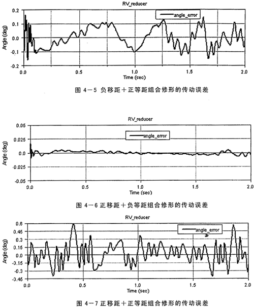分析采用修形量及得到的空程角誤差值見(jiàn)表4-1,由表中的結(jié)果統(tǒng)計(jì)的得出正移距+負(fù)等距組合修形的誤差值要小于其它兩種組合修形的值,可以羅好地滿足設(shè)計(jì)要求。