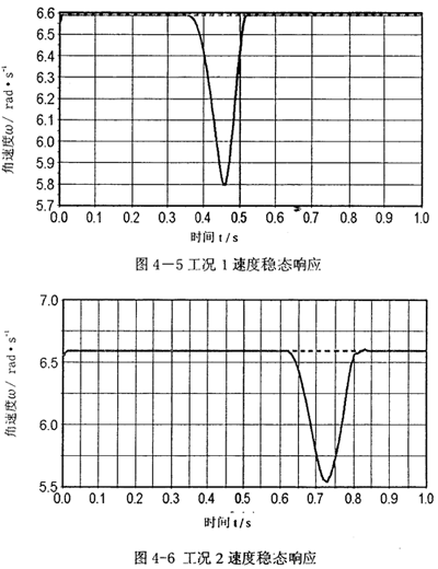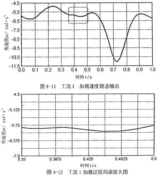 圖中慮線表示空載情況下ω的穩(wěn)態(tài)響應(yīng),可見很快達(dá)到穩(wěn)定,速度濾動很小,實(shí)線表示加載過程ω的穩(wěn)態(tài)響應(yīng)。顯然,在加載時段,當(dāng)載荷驟增時,會導(dǎo)致速度大幅降低。