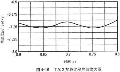以上兩組數(shù)據(jù)分析表明,加載時,經(jīng)柔性速度補(bǔ)償裝置速度補(bǔ)償后的速度輸出,在加載的時段,速度波動明顯減小,具體數(shù)值可參看其局部放大圖,另外,阻力矩和電機(jī)的主動力距和加柔性速度補(bǔ)償裝置前數(shù)值大小沒有明顯變化,表明對原機(jī)械系統(tǒng)的電機(jī)和其它動力、強(qiáng)度等一些性能參數(shù)沒有大的影響。